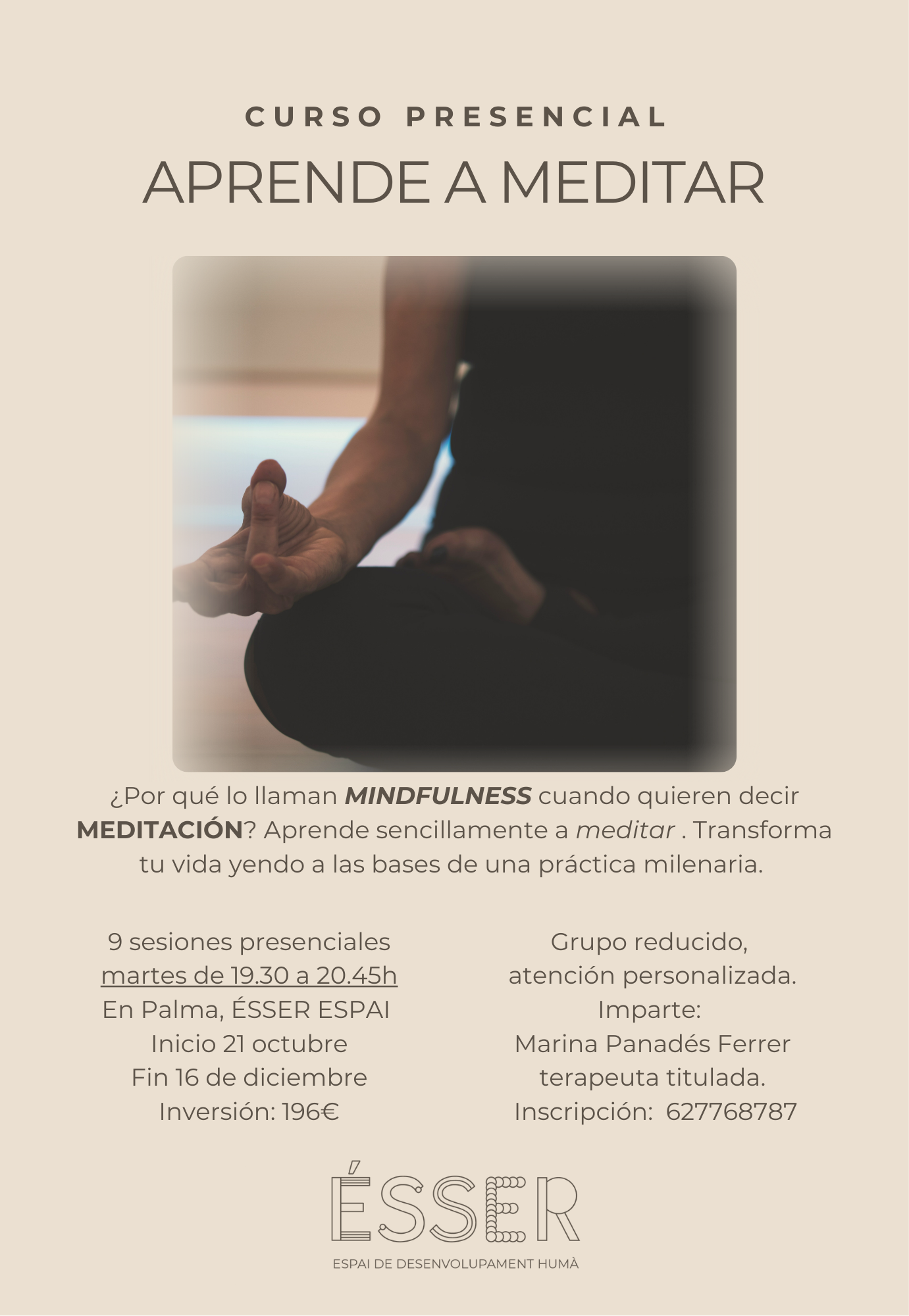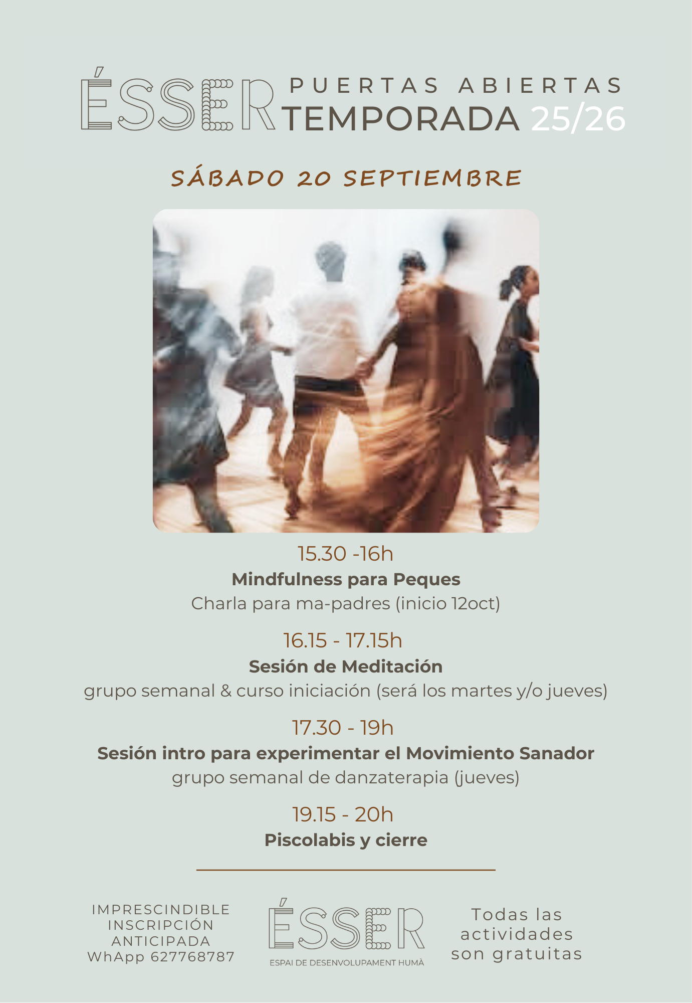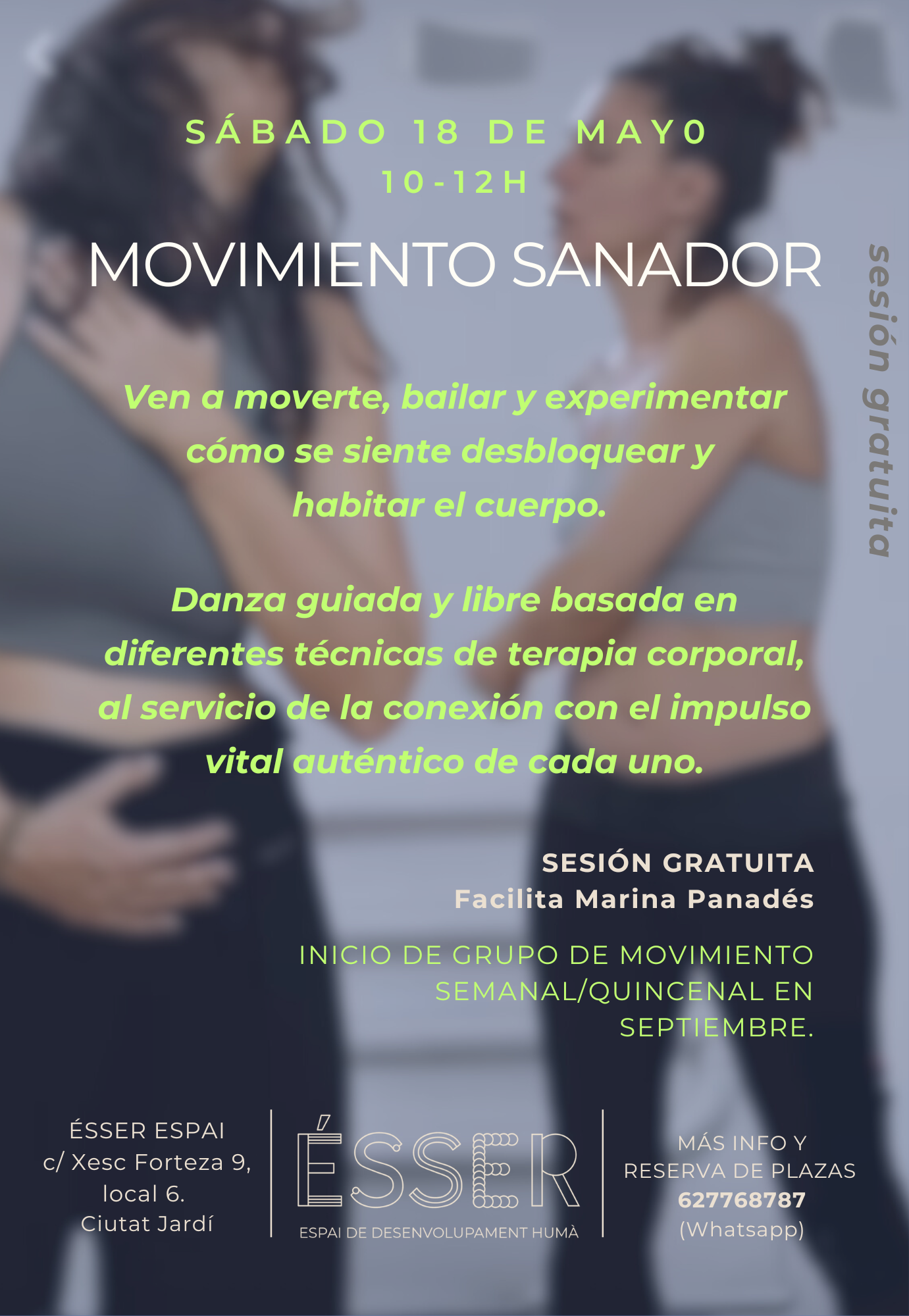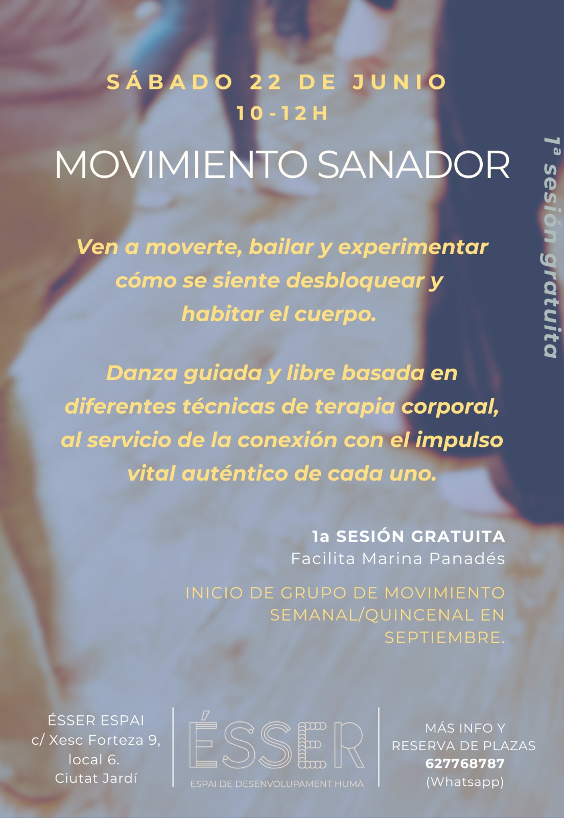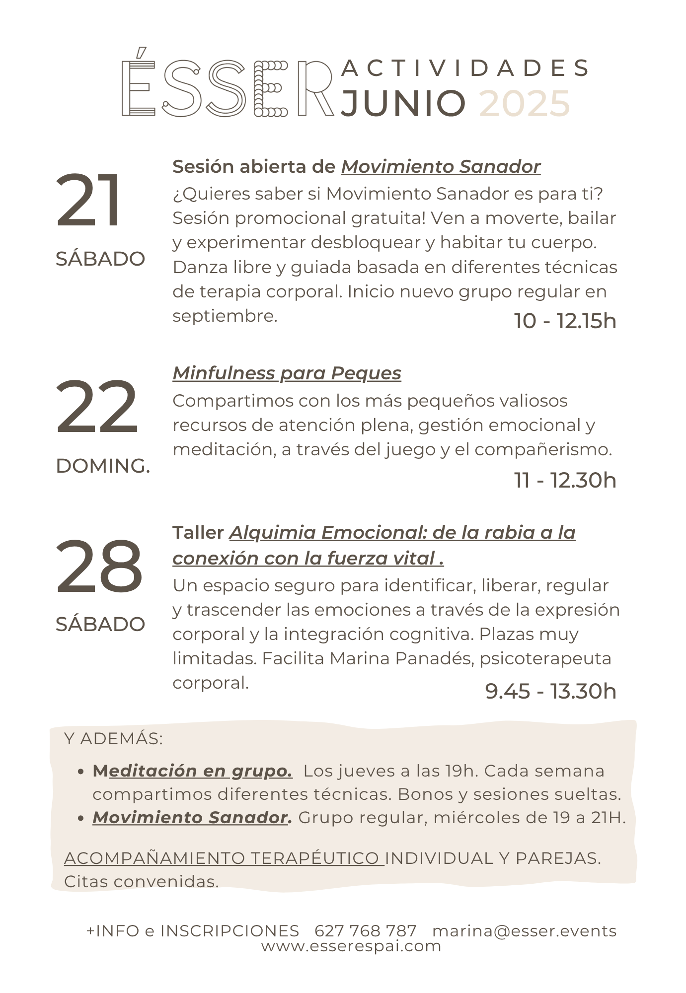 Imparte: Marina Panadés Ferrer, terapeuta titulada. Más información y consultas: marina@esserespai.com o Whatsapp 627768787 y coordinamos una llamada.