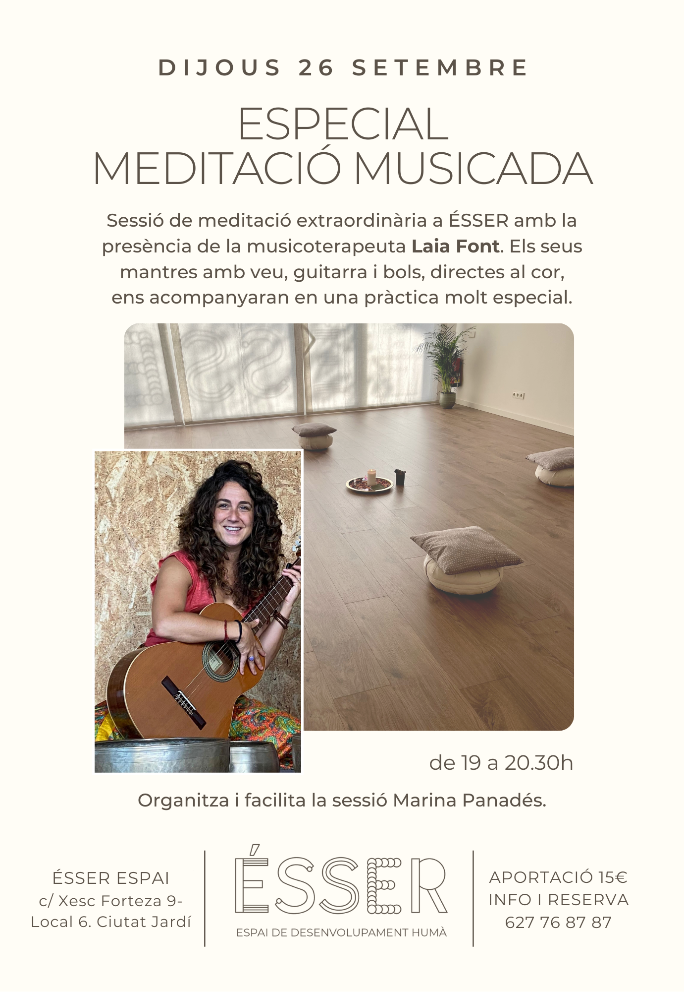 Todos los jueves a las 19h ofrecemos una práctica de meditación. El próximo jueves 26 será una sesión muy especial ya que contaremos con la presencia de LAIA FONT, musicoterapeuta. Nos acompañará en la práctica meditativa con mantras e inprovisación vocal, guitarra y cuencos tibetanos. Una verdadera delícia. Imprescindible reserva previa 627768787.